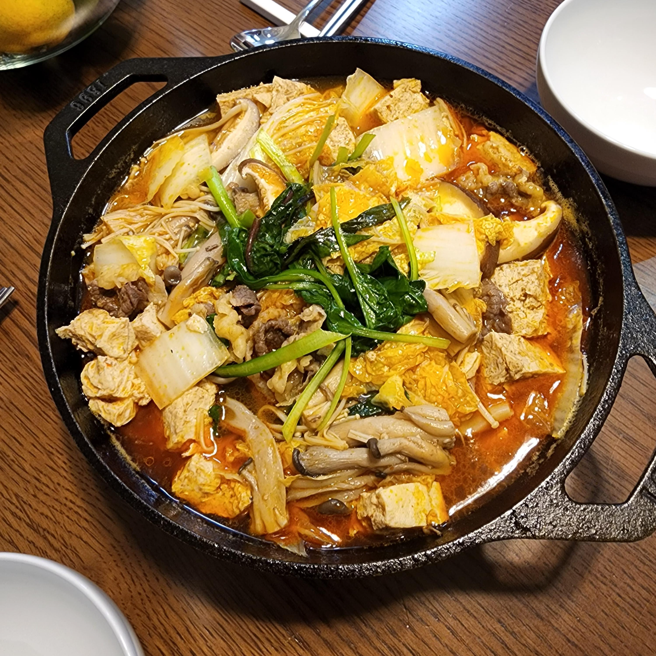 나는 주로 알배추, 버섯류들, 청경채, 넓적당면, 어묵, 유부, 얼린 두부, 고기는 주로 냉동 차돌박이 사용합니다.